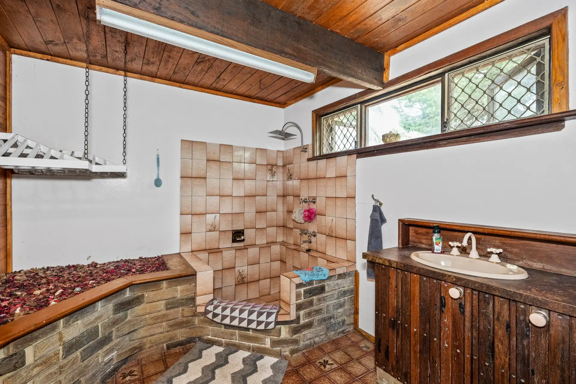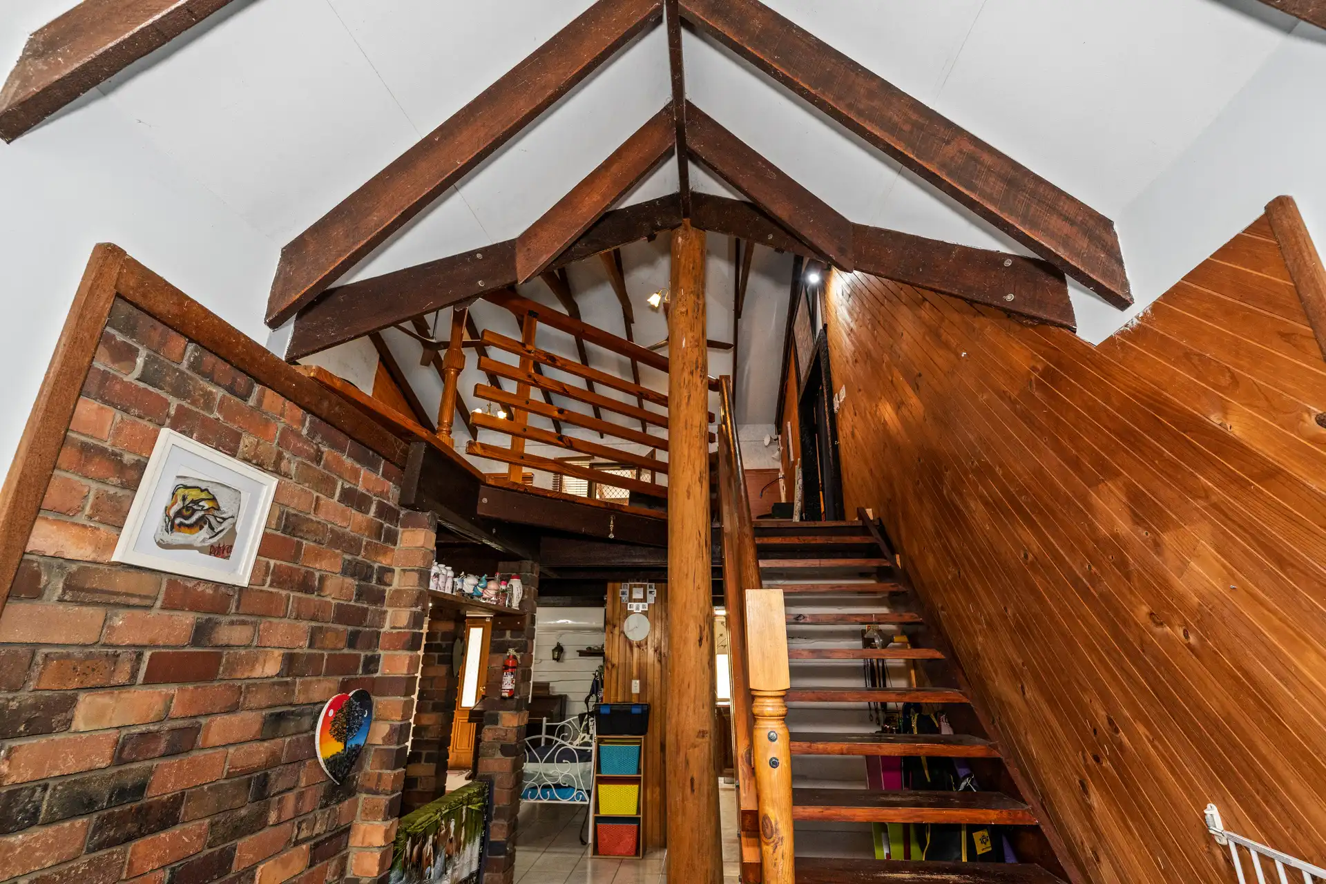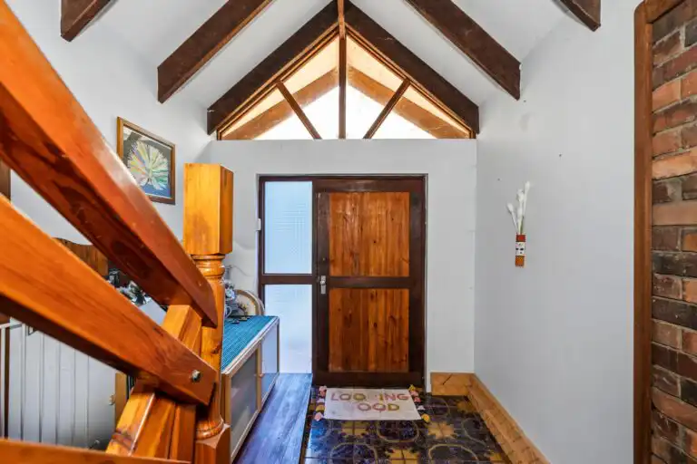 Exposed Timber Vaulting: The high vaulted ceilings, constructed from recycled timbers, lend a country charm.